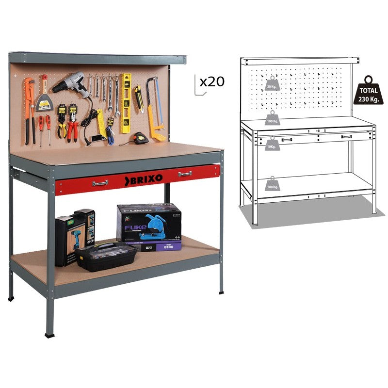 Banco de trabajo Tamaño: 120 x 60 x 155 cm Cajón: 112 x 44,5 x 6,26 cm Carga máxima: 230 kg, 100 kg/capa 20 kg para tablero perforado, 10 kg por cajón, incluye 20 ganchos
